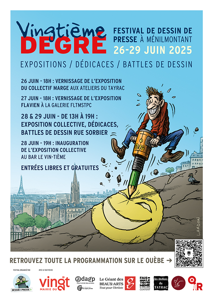 L’association Dessin de presse crée l’événement dans la capitale avec la première édition du festival VINGTIÈME DEGRÉ. Son ambition est à la fois de faire vivre le quartier en associant plusieurs lieux à la manifestation et de sensibiliser le public au dessin de presse et d’humour, ainsi qu’à la lecture des médias en règle générale. Découverte du dessin et de la presse, éducation aux médias et à l’esprit critique, rencontres culturelles locales et mise en avant de lieux de vie et d’expression du 20e arrondissement : telles sont les ambitions du festival VINGTIÈME DEGRÉ. INVITÉ(E)S : FAUJOUR, FLAVIEN, GAB, GROS, KAK, LARDON, MARANDIN, MARGE MÉDIA DESSINÉ, N.C, PAKMAN, PLACIDE, SOPH’ ET TRAX.